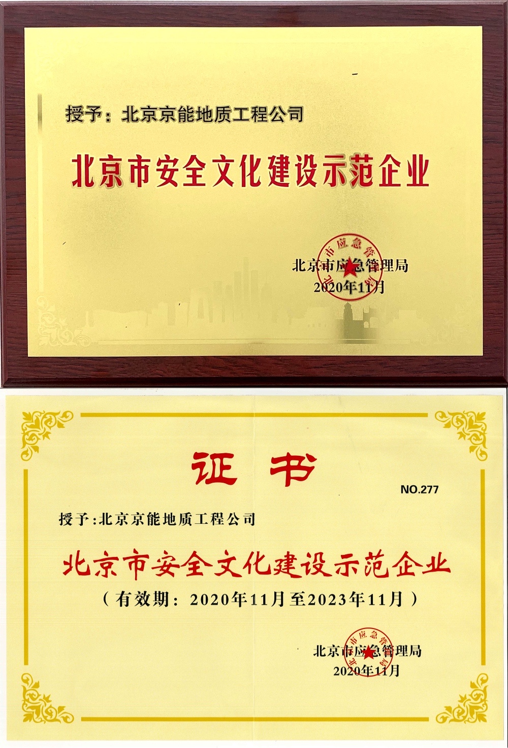 2020年11月,北京京能地質(zhì)工程公司順利通過北京市應(yīng)急管理局安全文化示范企業(yè)的評審,2021年1月12日正式授牌,獲得“北京市安全文化建設(shè)示范企業(yè)”榮譽(yù)稱號。