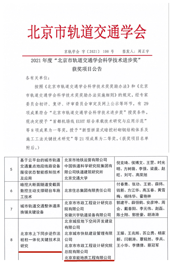 7月21日,北京市軌道交通學會公布《2021年度“北京市軌道交通學會科學技術進步獎”獲獎項目公告》(京軌學會字[2021]100號),北京京能地質工程有限公司的《北京市上下同步逆作法樁柱一體化關鍵技術及研究項目》榮獲北京市軌道交通學會科學技術進步獎”二等...