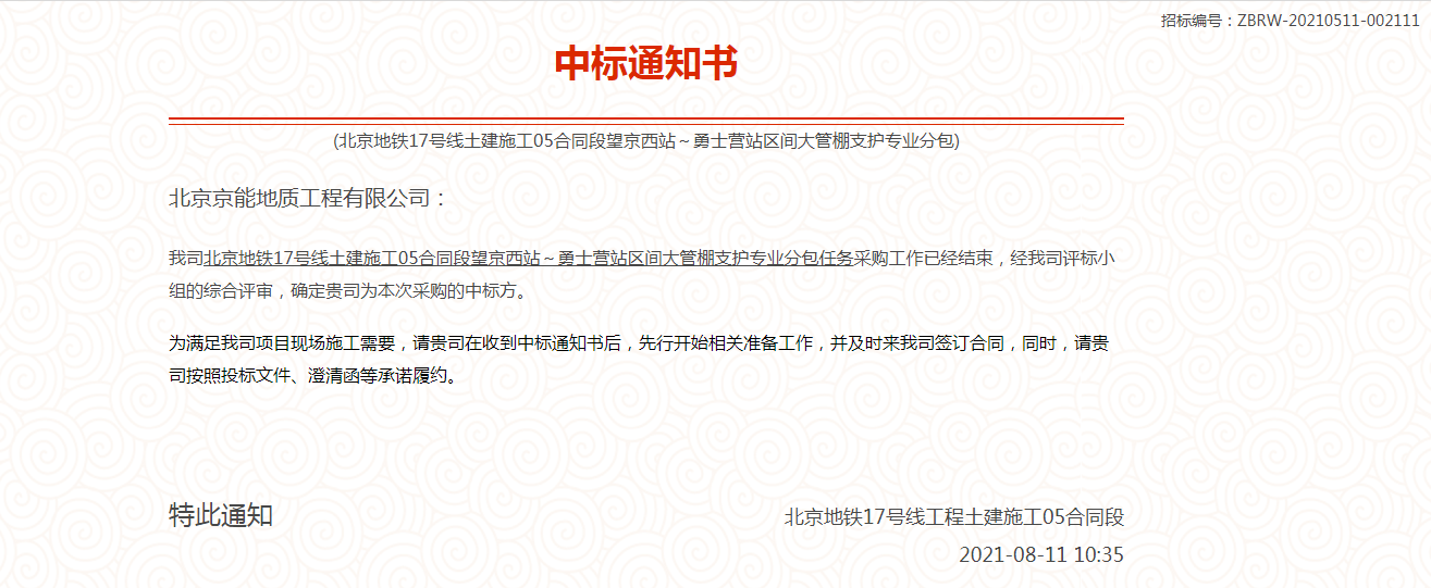 近日,北京京能地質工程有限公司成功中標“北京地鐵 17 號線土建施工 05 合同段望京西站——勇士營站區(qū)間大管棚支護”項目。