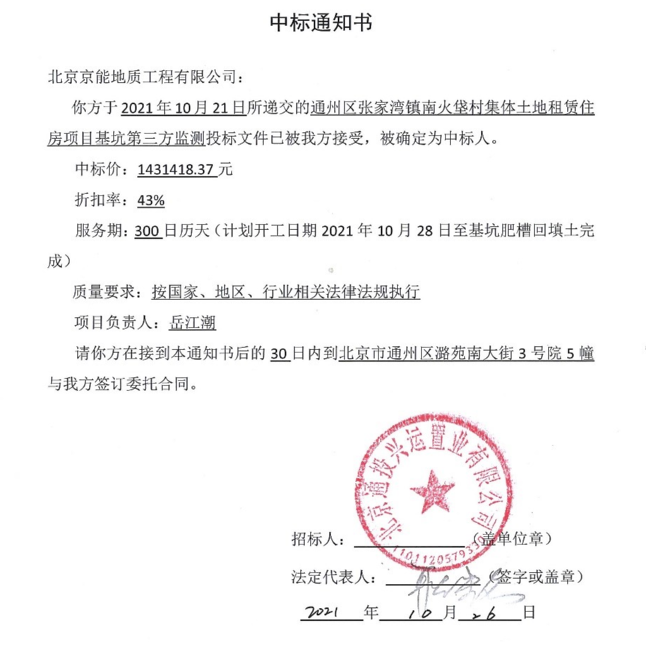 近日,北京京能地質工程有限公司成功中標“通州區(qū)張家灣鎮(zhèn)南火垡村集體土地租賃住房項目基坑第三方監(jiān)測項目”,中標金額1431418.37元。