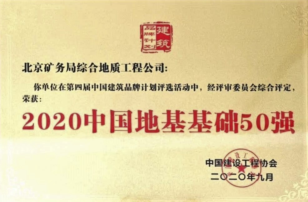 9月29日,北京礦務(wù)局綜合地質(zhì)工程公司在第四屆中國建筑品牌評選活動中,被中國建設(shè)工程協(xié)會、中國建筑品牌發(fā)展計劃工作委員會評定為“2020年中國地基基礎(chǔ)50強(qiáng)”,并頒發(fā)了榮譽(yù)證書,對公司一年來的付出與貢獻(xiàn)給予了充分肯定。