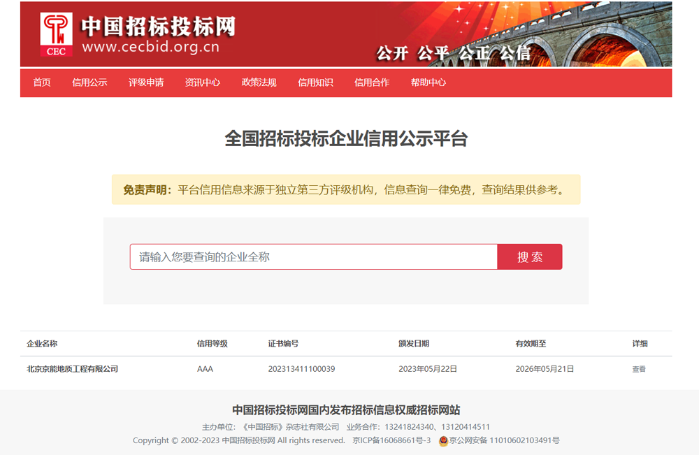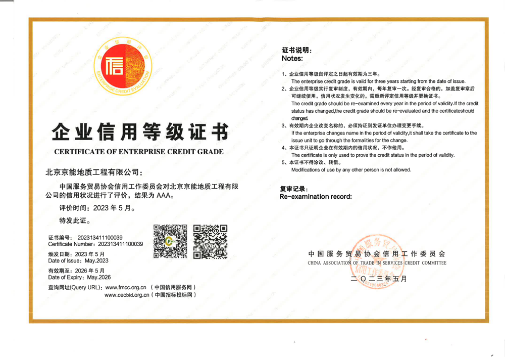 近日,北京京能地質(zhì)工程有限公司順利完成企業(yè)信用評價的復(fù)評工作,再次成功取得企業(yè)信用等級AAA級證書。