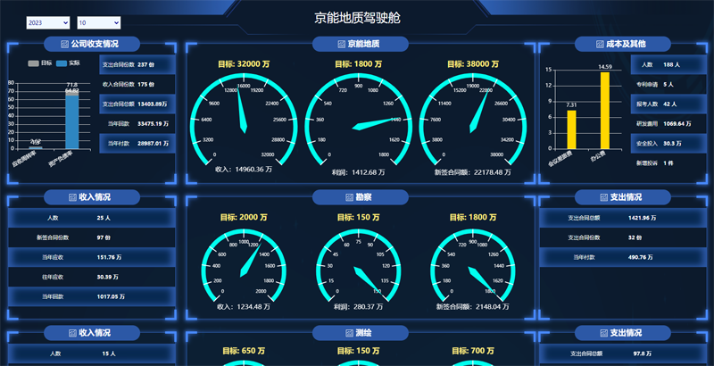 “京能地質(zhì)駕駛艙”模塊提供了公司整體的經(jīng)營(yíng)指標(biāo)展示。管理人員可以清晰地了解公司在全年的經(jīng)營(yíng)狀況,有助于管理層對(duì)公司整體經(jīng)營(yíng)情況有一個(gè)全面的把握,從而做出相應(yīng)的決策。