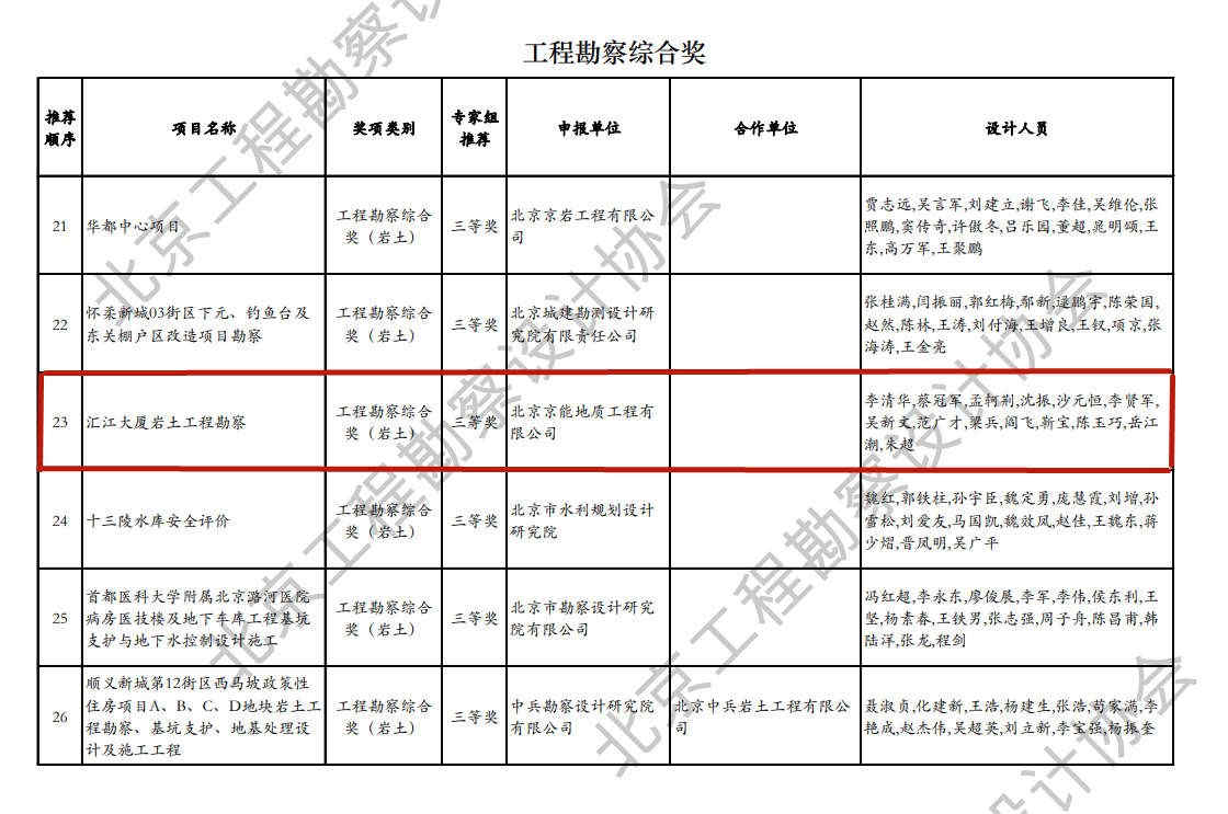 北京京能地質工程有限公司收到相關信息后,認真準備整理相關材料報送,北京市勘察設計協(xié)會經過層層篩選,嚴格評選,于2021年7月27日,官網發(fā)布了2021年“北京市優(yōu)秀工程勘察設計獎”推薦獲獎項目清單,京能地質公司憑借《匯江大廈巖土工程勘察項目》獲得2021年“北京市優(yōu)秀工程勘察設計獎”工程勘察綜合獎(巖土)三等獎。