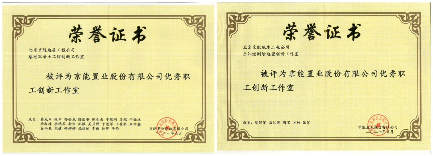 2021年12月10日,北京京能地質(zhì)工程有限公司收到了京能地產(chǎn)平臺2020 年優(yōu)秀職工創(chuàng)新工作室、科技創(chuàng)新、全員創(chuàng)新等三項多個榮譽證書。